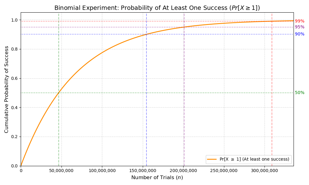 This random variable is still a binomial; we can take the cumulative probability function with respect to \(n\), which would show how the probability to find at least one valid hash increases with the choice of \(n\).